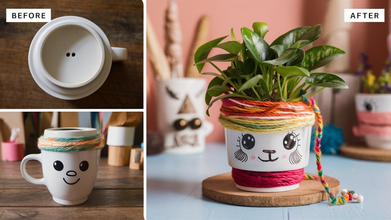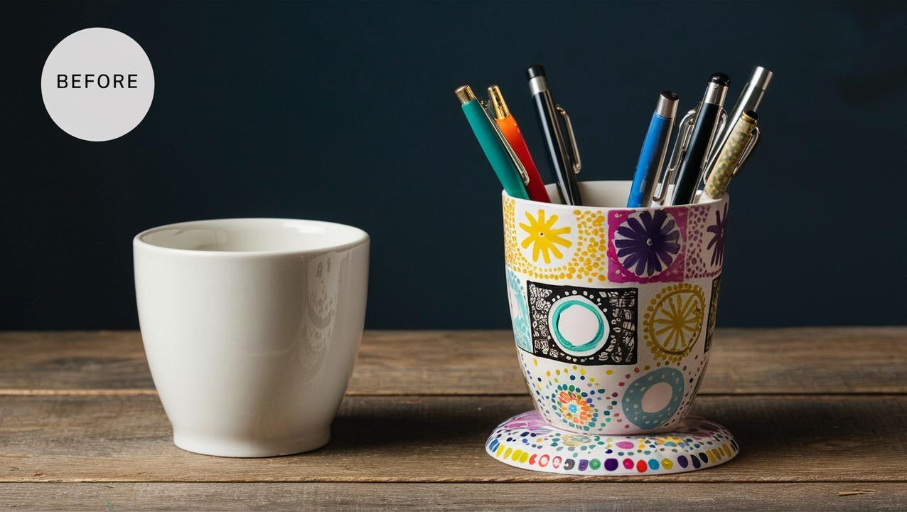 On the left, a plain white ceramic cup. On the right, a colorful decorated cup is holding various pens and pencils. The decorated cup features patterns like circles, dots, and floral designs in shades of yellow, purple, blue, and black, adding to the vibrant and creative scene.
