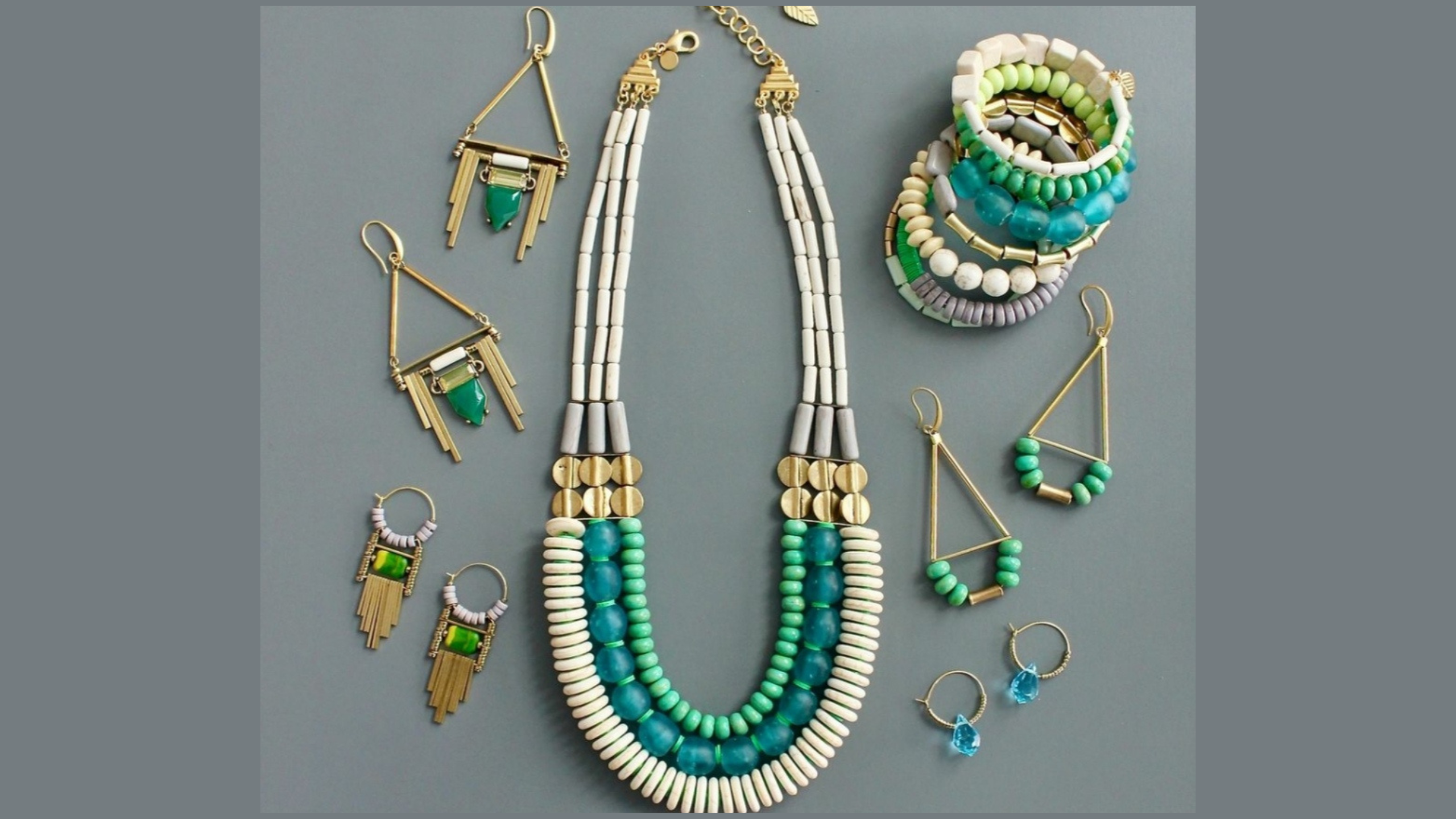 A collection of jewellery featuring a beaded necklace, matching earrings with green stones, and a stack of colourful bracelets.