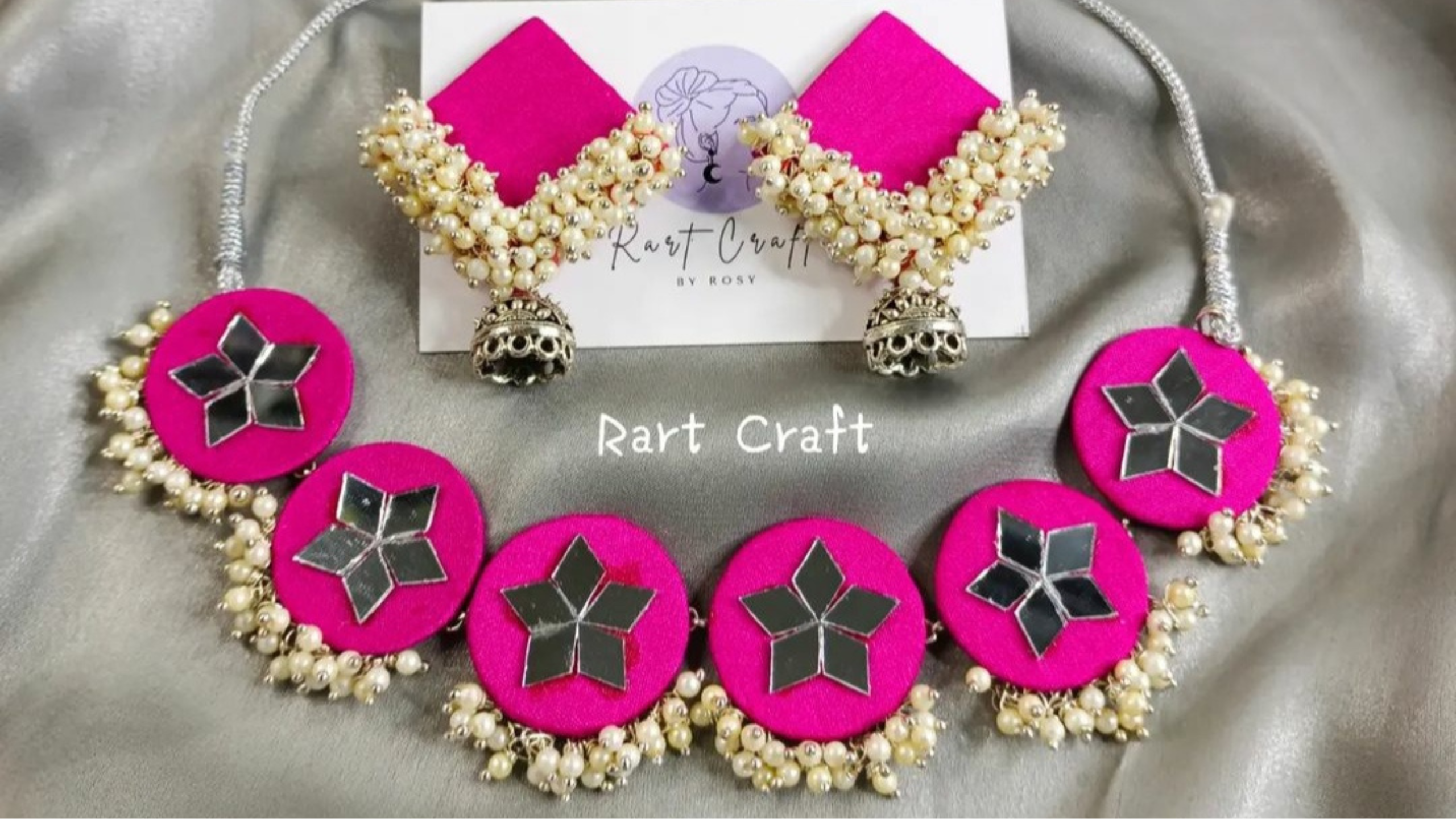 A vibrant jewellery set with a pink and silver necklace and matching earrings, featuring pearl detailing and mirror accents.