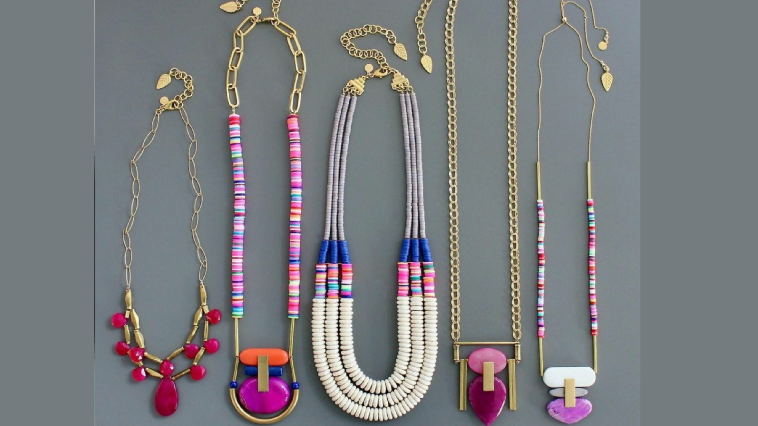 A display of six colourful necklaces with various designs, featuring beads, chains, and geometric pendants on a grey background.