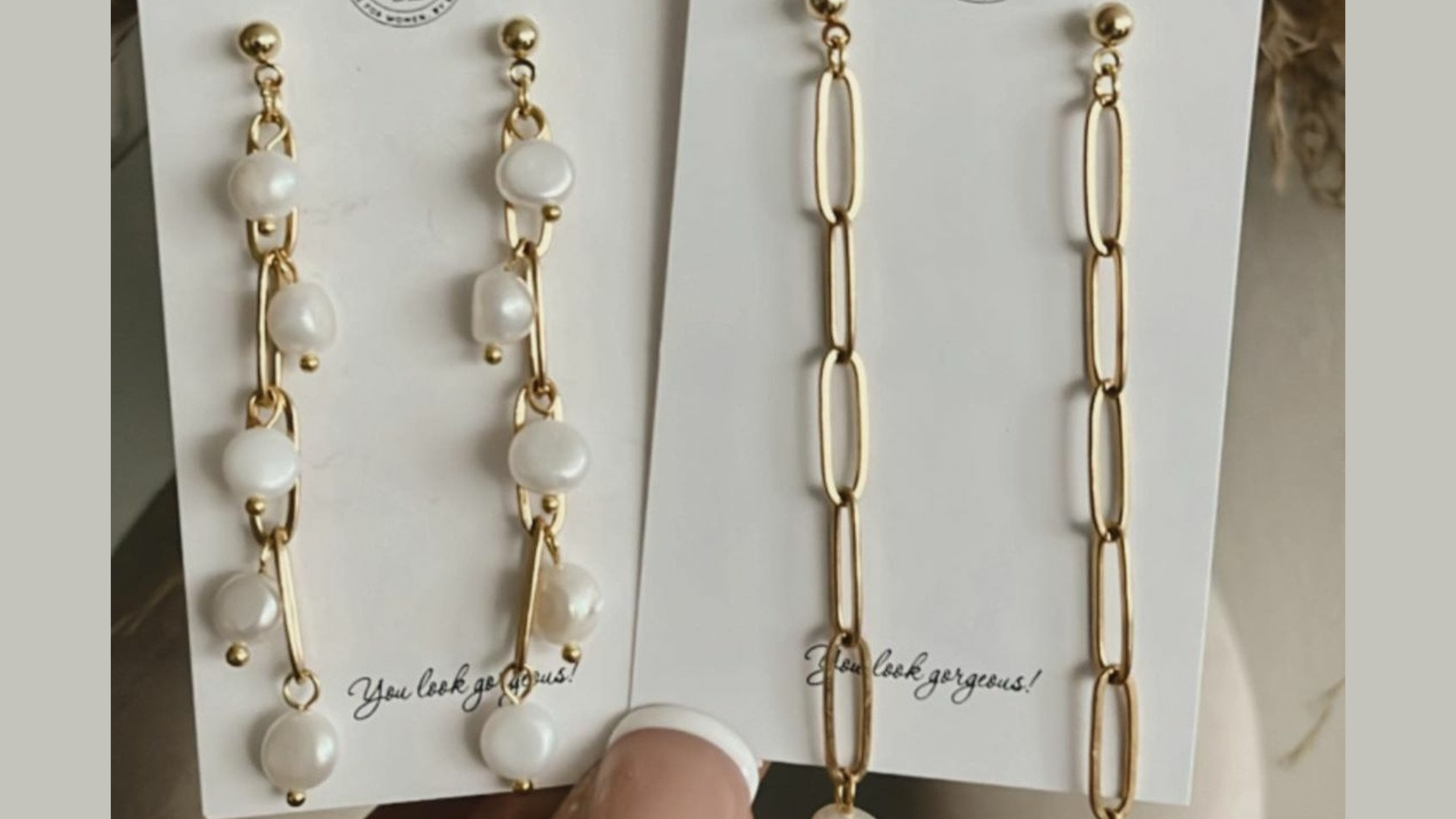 Two pairs of gold earrings with pearl accents, displayed on white cards