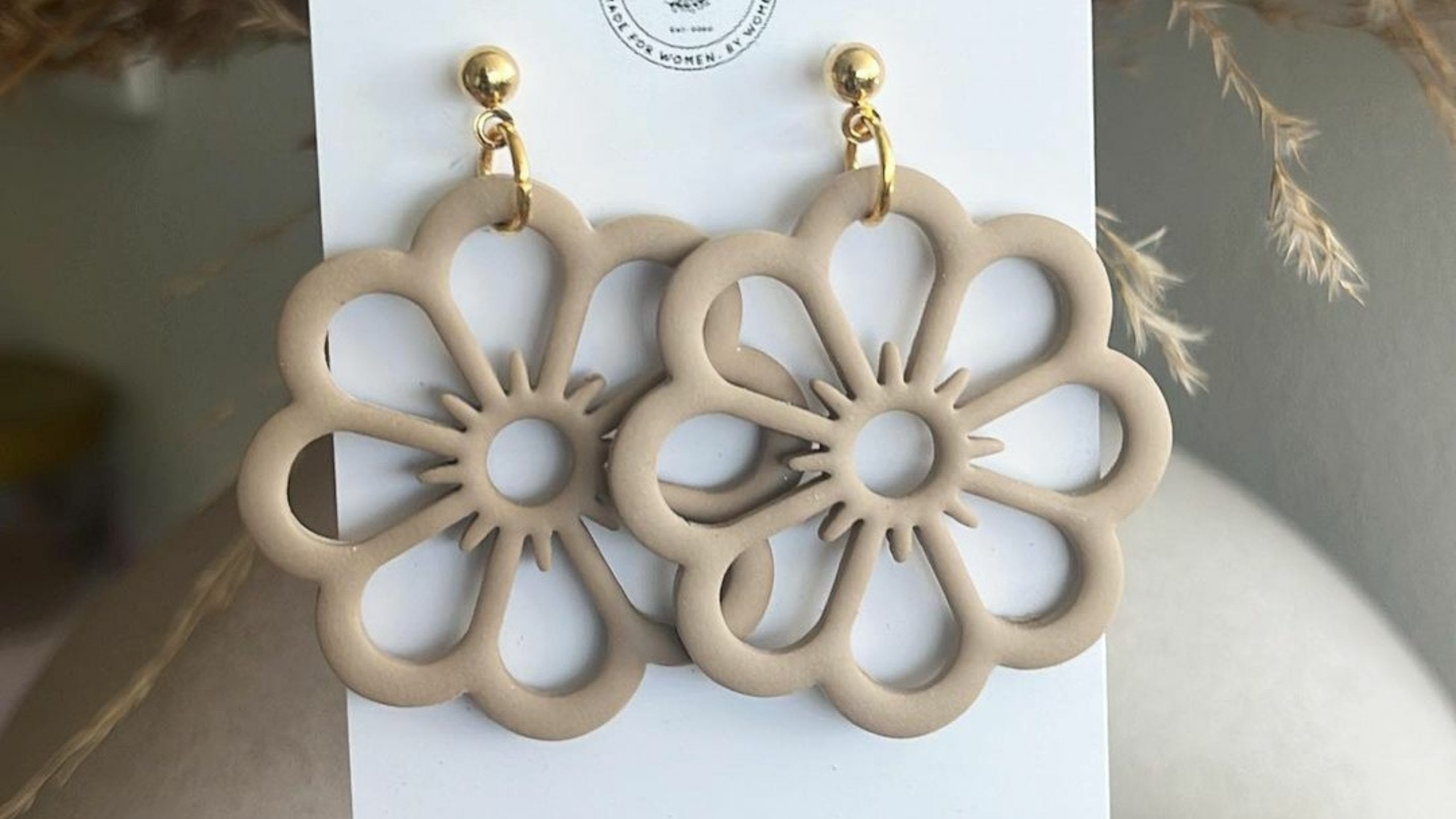 Flower-shaped earrings made from repurposed trash, beige with gold studs.