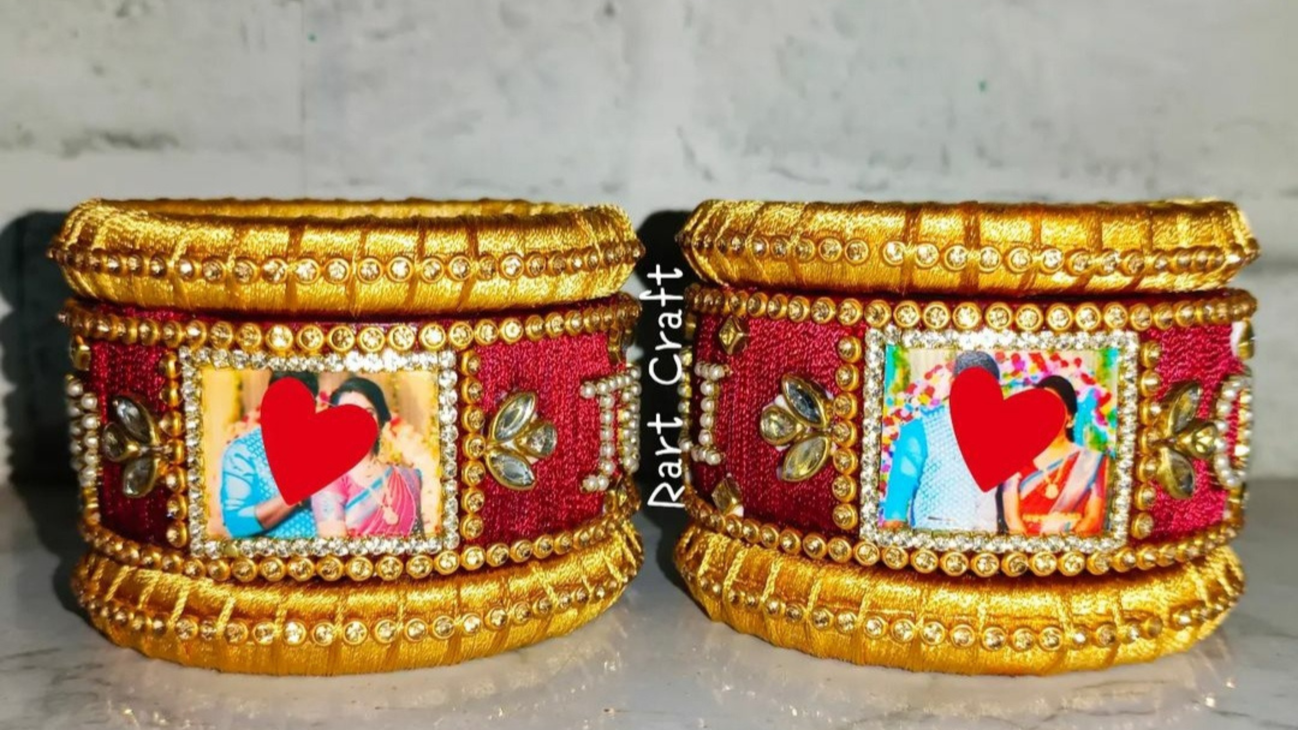 The jewellery consists of two ornate gold bangles with red accents, adorned with gemstones and small framed photos.